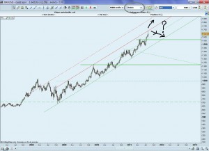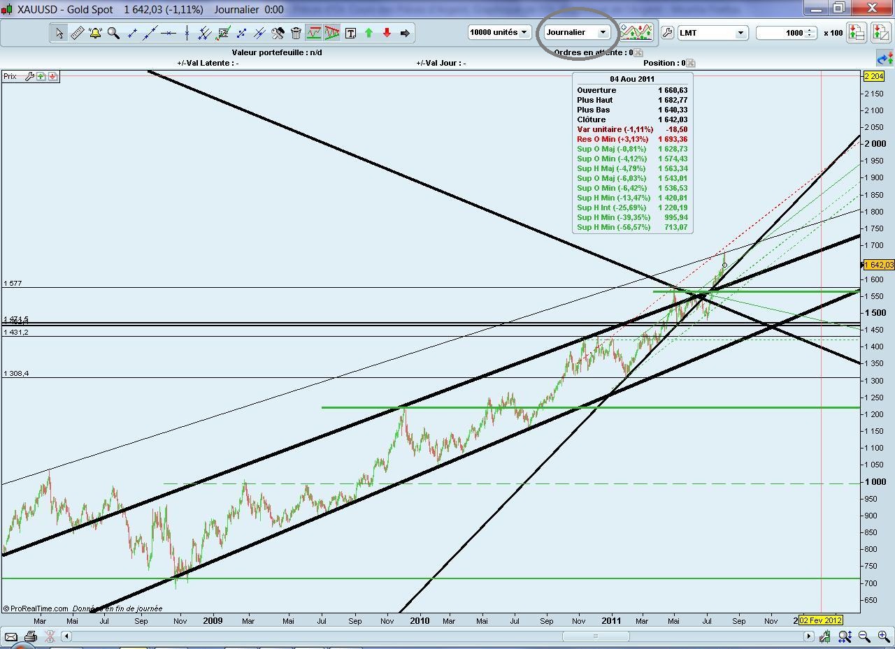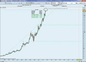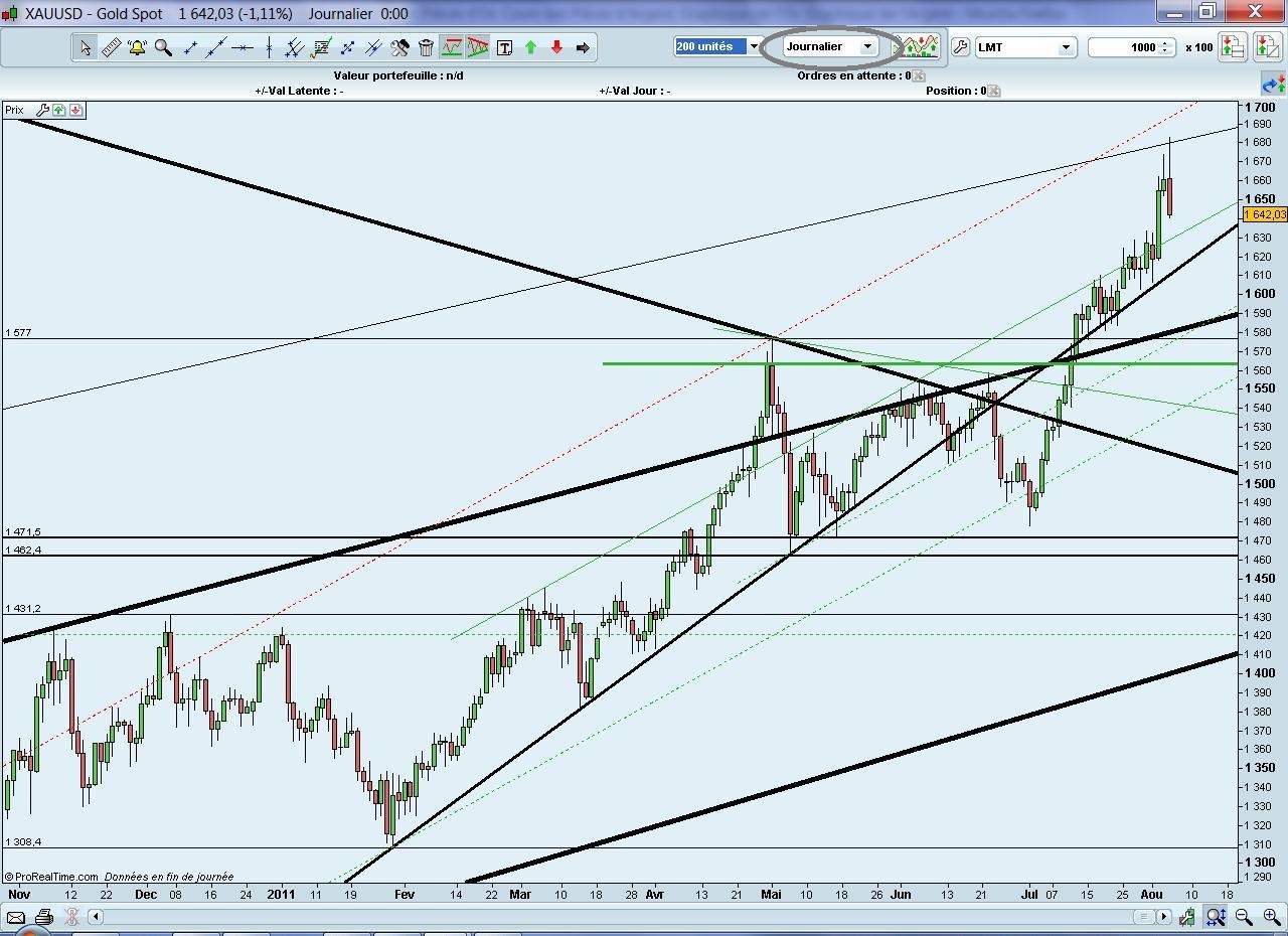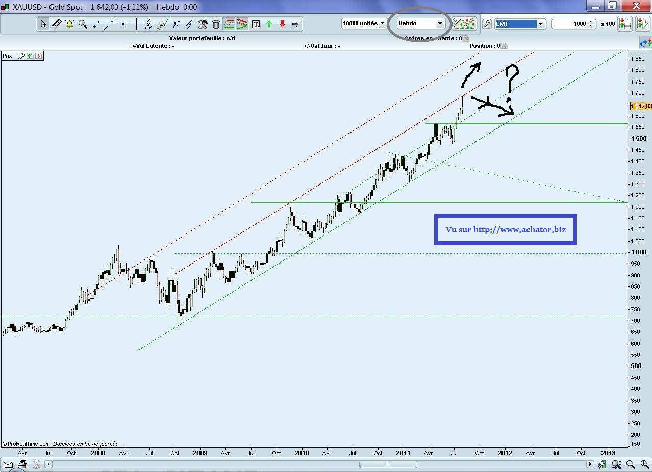 Une rupture du support indiquerait – CONDITIONNEL – une fin de la hausse de l’or. A contrario, un franchissement à la hausse de la résistance indiquerait – CONDITIONNEL plus certain … -une continuation de la hausse de l’or. Support et résistance du cours de l’or en données journalières depuis 2008 et un petit zoom du journalier tant que les supports tiennent et que le marasme économique est là …. aucune raison – selon moi – pour que la hausse de l’or stoppe !! Inscrivez-vous à la newsletter de Achator pour avoir l’indication du retournement du marché de l’or. Entrez et profitez de la hausse c’est plutôt facile, savoir sortir … là faudra l’anticiper le changement dans le cours de l’or