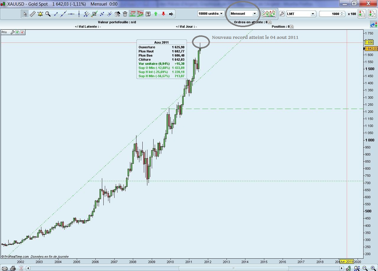 Graphique pour suivre la tendance haussière de l’orCliquez sur les images pour voir les cours en grands Support et résistance du cours de l’or en données mensuelles depuis 2000 Support et résistance du cours de l’or en données hebdomadaires depuis 2008